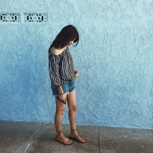 (Wearing: Shein off-the-shoulder blouse, Vintage Lee's cut offs, Madewell sandals, Ray Ban sunglasses)